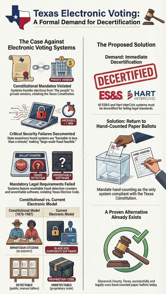 🚨 BREAKING: Texas SOS quietly certified the Hart Vanguard voting system on March 31, 2026 despite its own examiners’ reports (including the Attorney General-appointed examiner and multiple SOS examiners) declaring it vulnerable to hacking and large-scale election fraud.