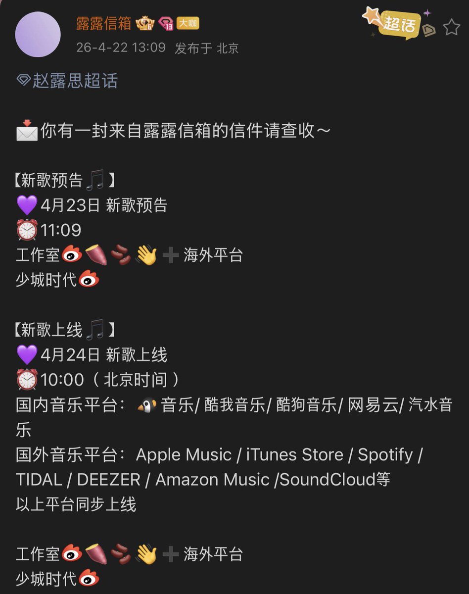 Another song from zhao lusi coming out on the 24th! 【🎵 New Song Preview】 💜 April 23 – New song preview ⏰ 11:09 Studio (Weibo) + overseas platforms (Shaocheng Times Weibo) 【🎵 New Song Release】 💜 April 24 – New song officially released ⏰ 10:00 (Beijing time) Domestic