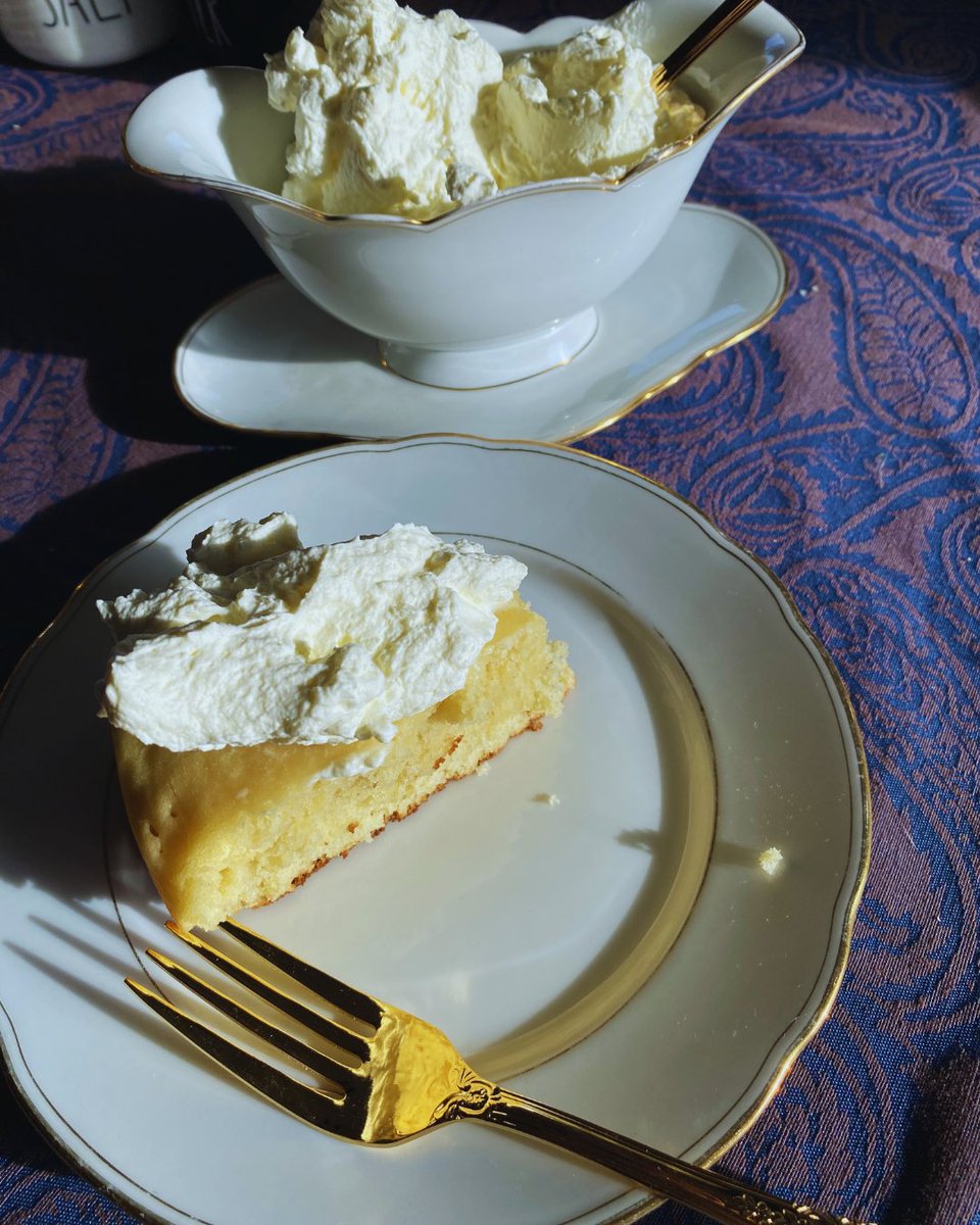 I totally did get inspired and made a thing. Not sure if we can call it a pancake (although for sure cake). Homemade whipped cream to top it off (never thought of using my gravy boat for this before, but I felt fancy)