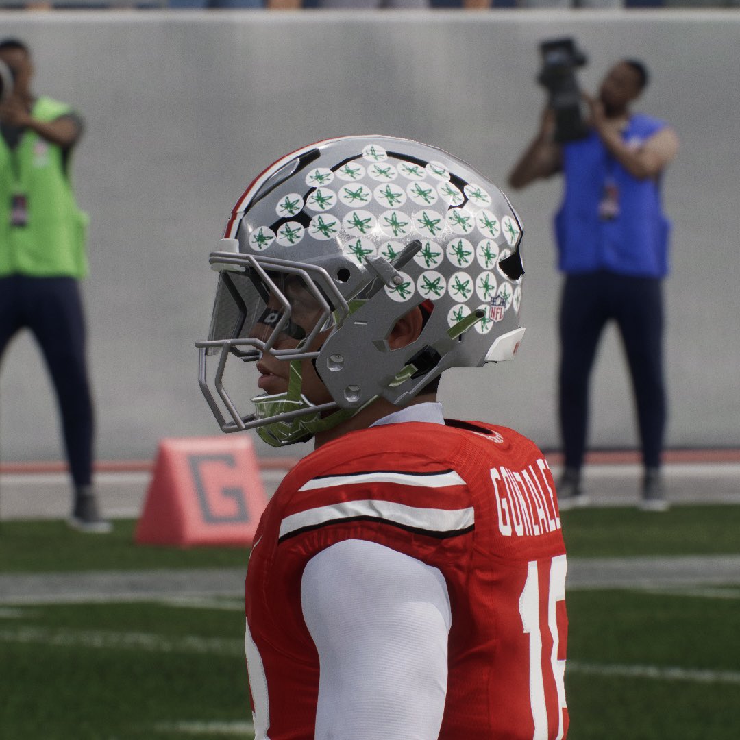EA Devs need to get helmets fits right this year. - Add helmet tilt to every face (very easy to accomplish) - Fix helmet proportions - Fix the many incorrect and outdated face mask Mesh’s This photo was captured within the Madden/CFB engine.