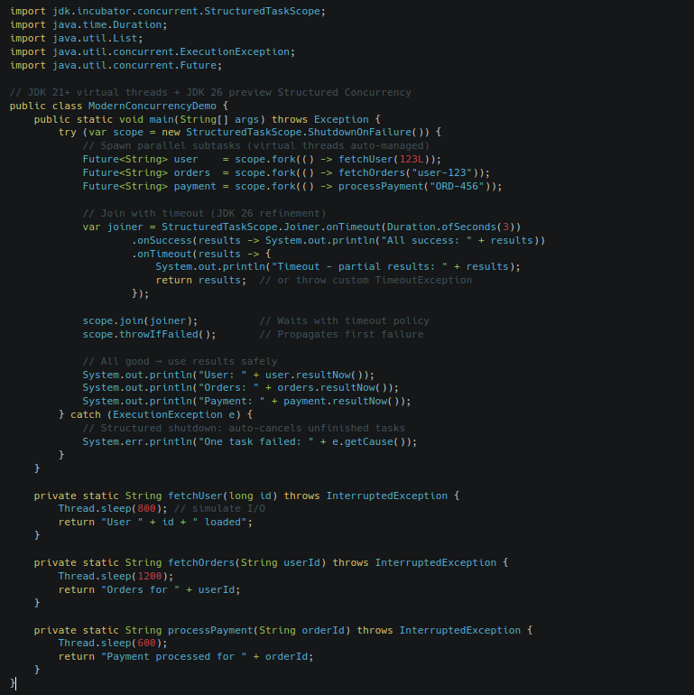 Java's Modern Concurrency Dream: Virtual Threads + Structured Concurrency – No More Callback Hell: In JDK 21+ (LTS) and refined through JDK 26 previews, virtual threads (Project Loom) + Structured Concurrency give you lightweight, millions-scale concurrency without the pain of
